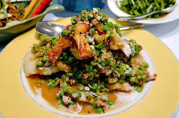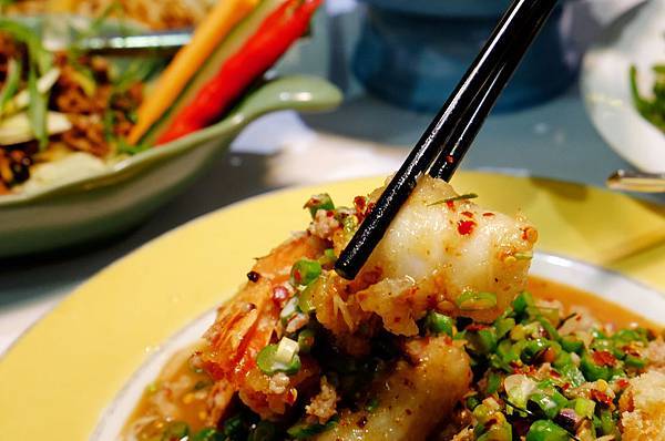搭配店家自製的酸甜羅望子醬汁、豬肉末與青翠長江豆淋至海鮮上,